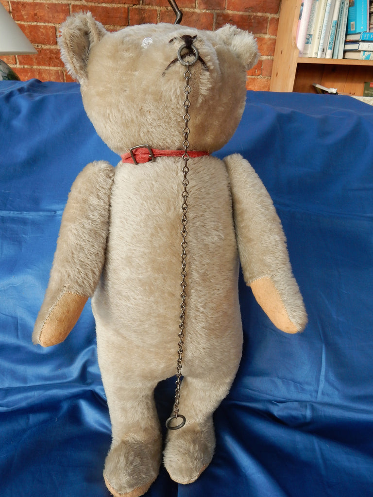 ’Twinkle’ a rare American electric eyed teddy bear 1910-20s, with pale blue mohair, light bulb eyes, black stitched nose and mouth with nose ring and chain, jointed arms with felt pads, card lined feet, original red oil-cloth collar and switch in ear —24in. (61cm.) high (damaged feet pads, slight wear and fading, lights not working)