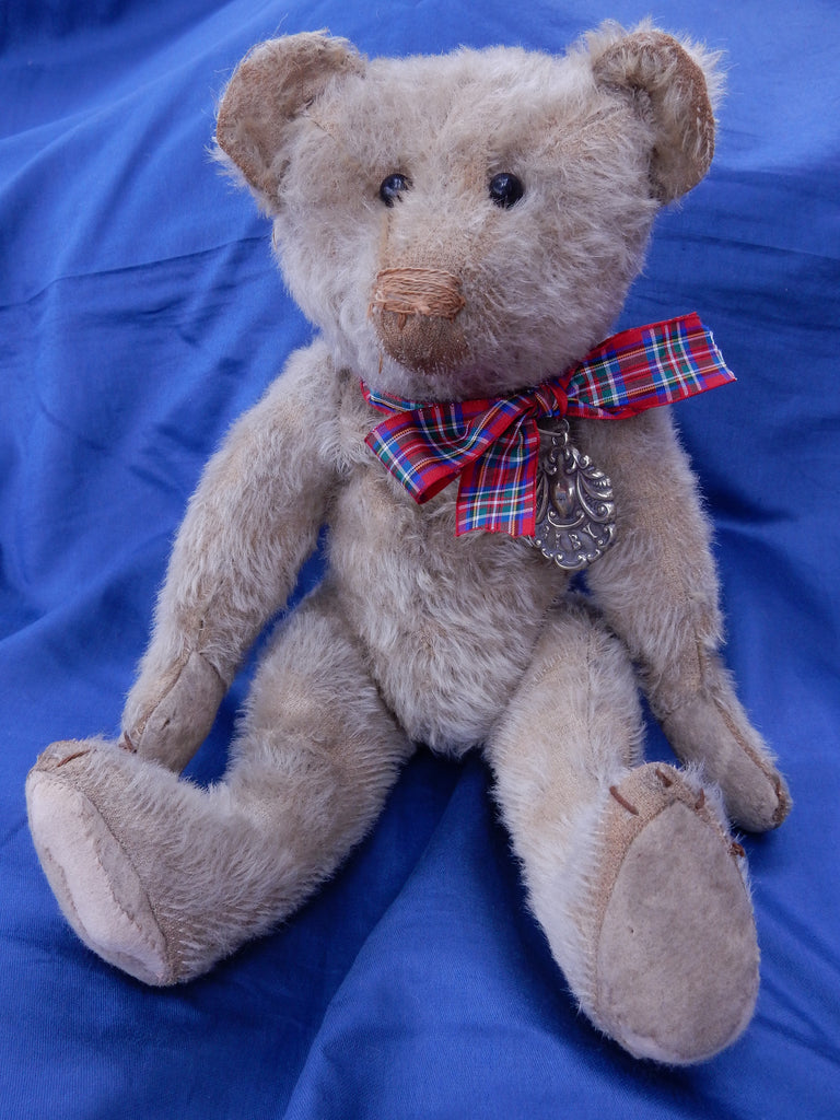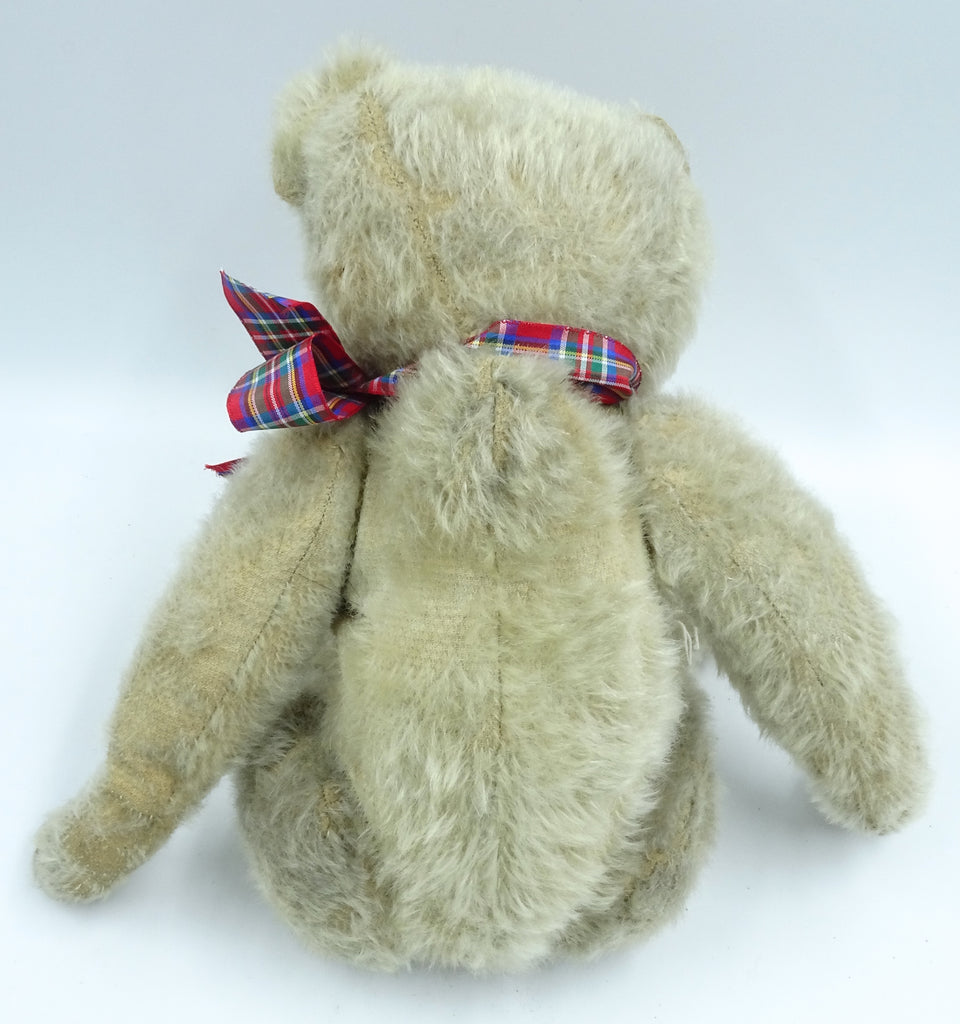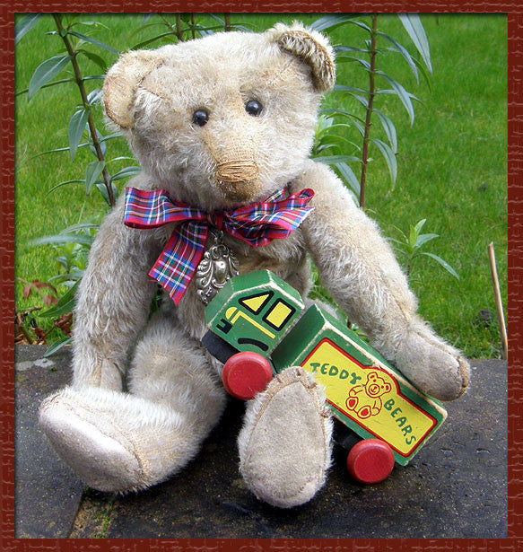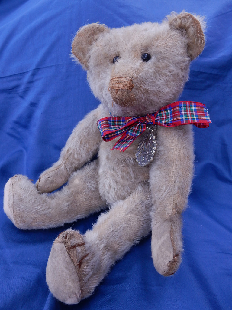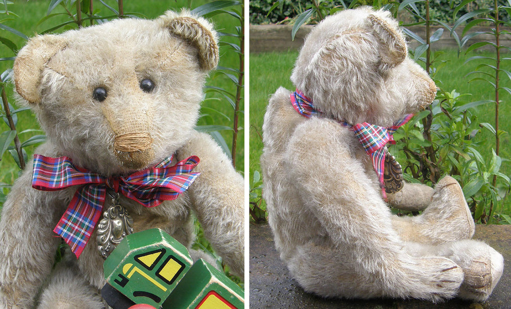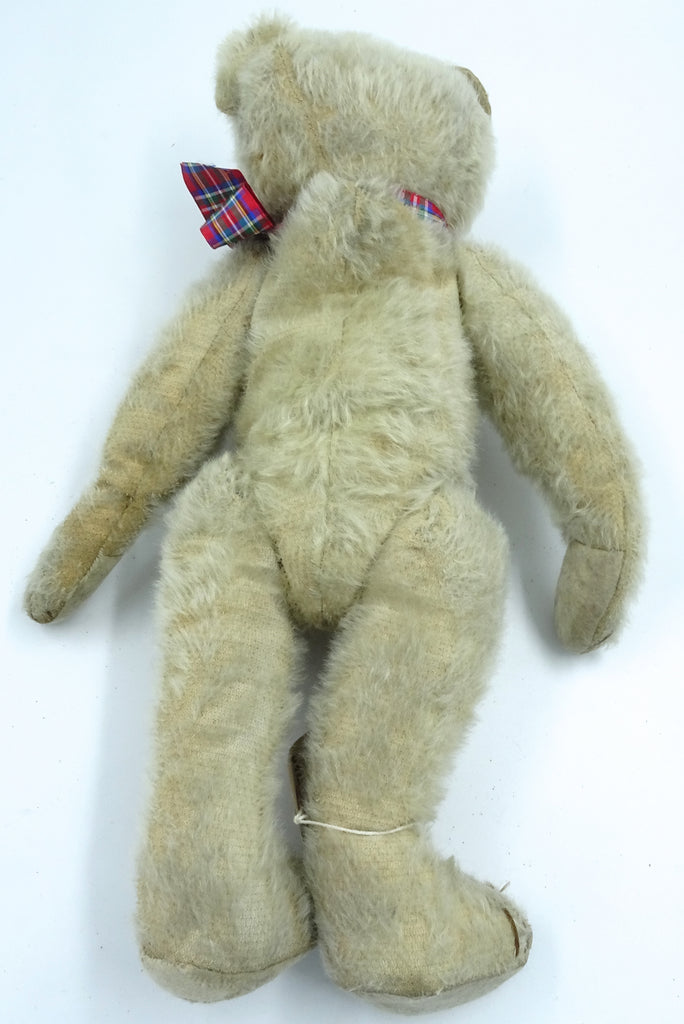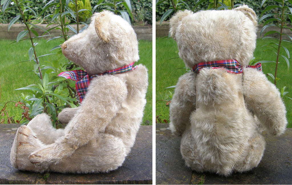 This gorgeous old boy dates c1907 and has a fabulous expression. There is some overall wear to the cream mohair and he has had some professional restoration to the pads. Ted is filled with wood wool and has a non-working side bellows squeaker in his tum. He has original boot button eyes, original brown nose and claw stitching and he measures 16” tall.