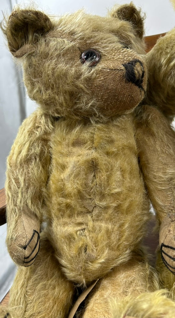 Tumble is a Terry's moon eyed bear from 1919. He has an upturned shaved original not quite triangular now shield shaped nose. He has clear eyes with painted backs with huge black pupils and a front final seam. He has webbed paws and is woodwool stuffed. A very handsome chap who comes with his big brother.
