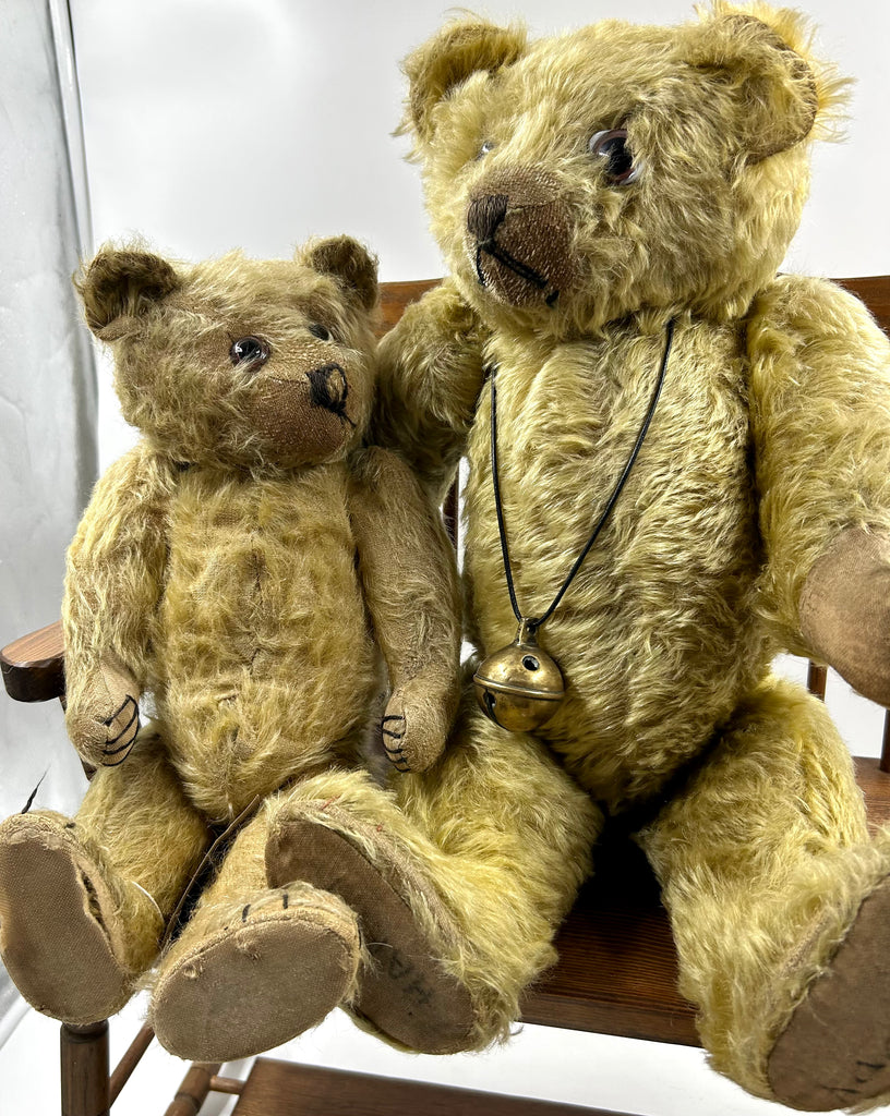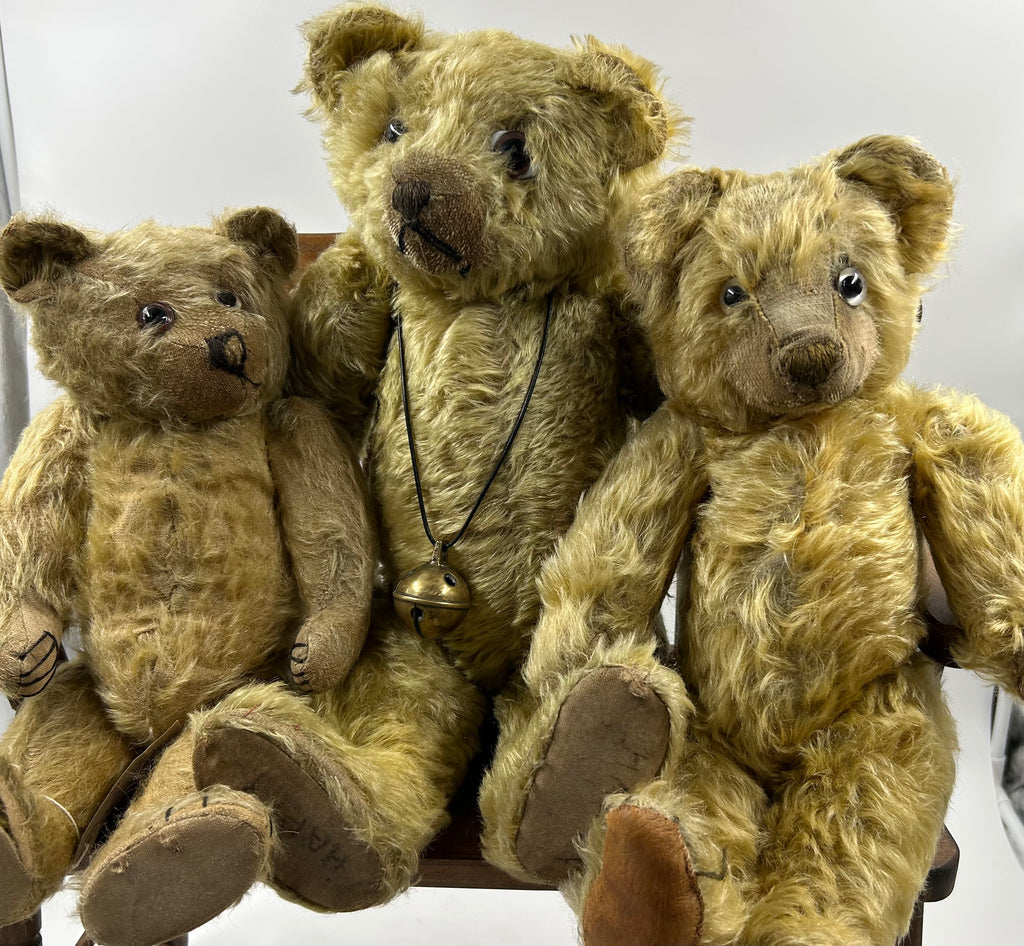 Happy is a magnificent 1914 Terry's bear. He has long luscious mohair and 'Happy' written on his huge linen feet. He is stuffed with wood-wool. He is fully jointed with clear and black glass eyes with rather odd white bits. He has a vertically stitched nose on a shaved muzzle and an inverted V shape mouth stitching. A magnificent bear.