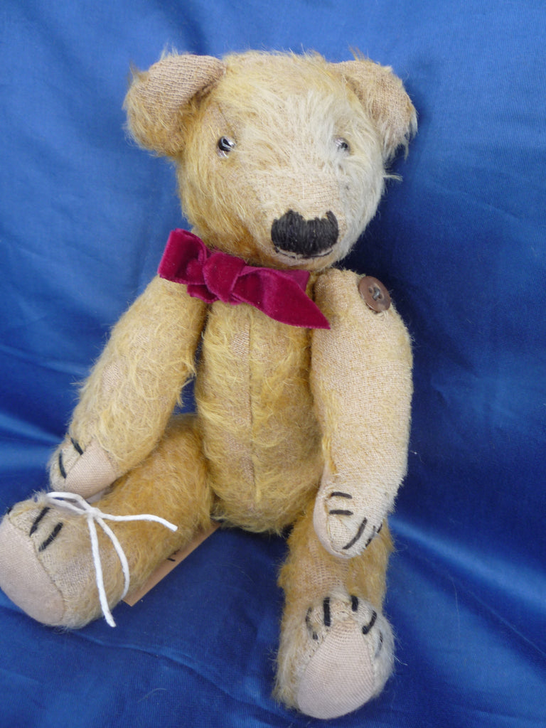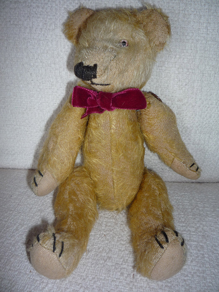 ’Roderick’ a British teddy bear circa 1920, with golden mohair, clear and black glass eyes, pronounced clipped muzzle, black stitched nose, mouth and claws, swivel head, pin-jointed limbs with cloth pads and cork stuffed —10 1/2in. (26.5cm.) high (bald spots and wear, small repaired hole in leg