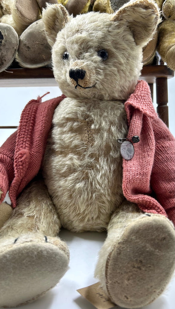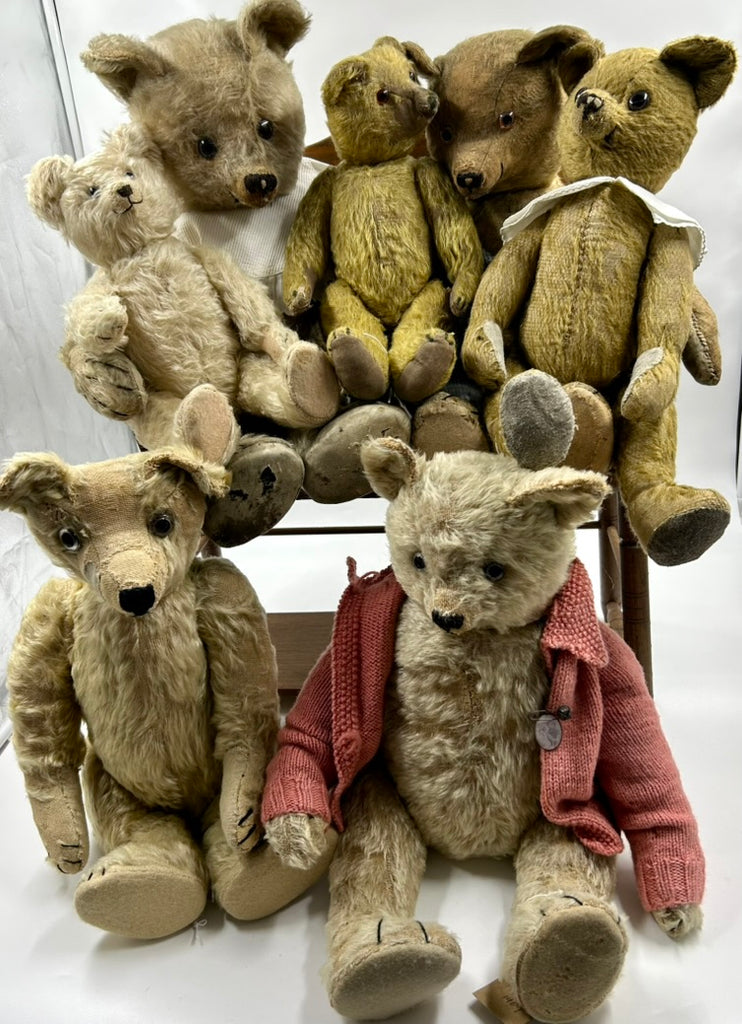 Rare and wonderful antique teddy bear by British firm Harwin & Company.The factory in North London ceased in 1930 so very few of these bears survive. A rare 1915 Harwin Teddy Bear with golden mohair, oily clear and black glass eyes with remains of dark brown painted backs, black stitched nose with nostrils, W shaped mouth and long claws, ears set on the sides, swivel head, jointed elongated limbs with felt pads, hump and growler. 20' tall.