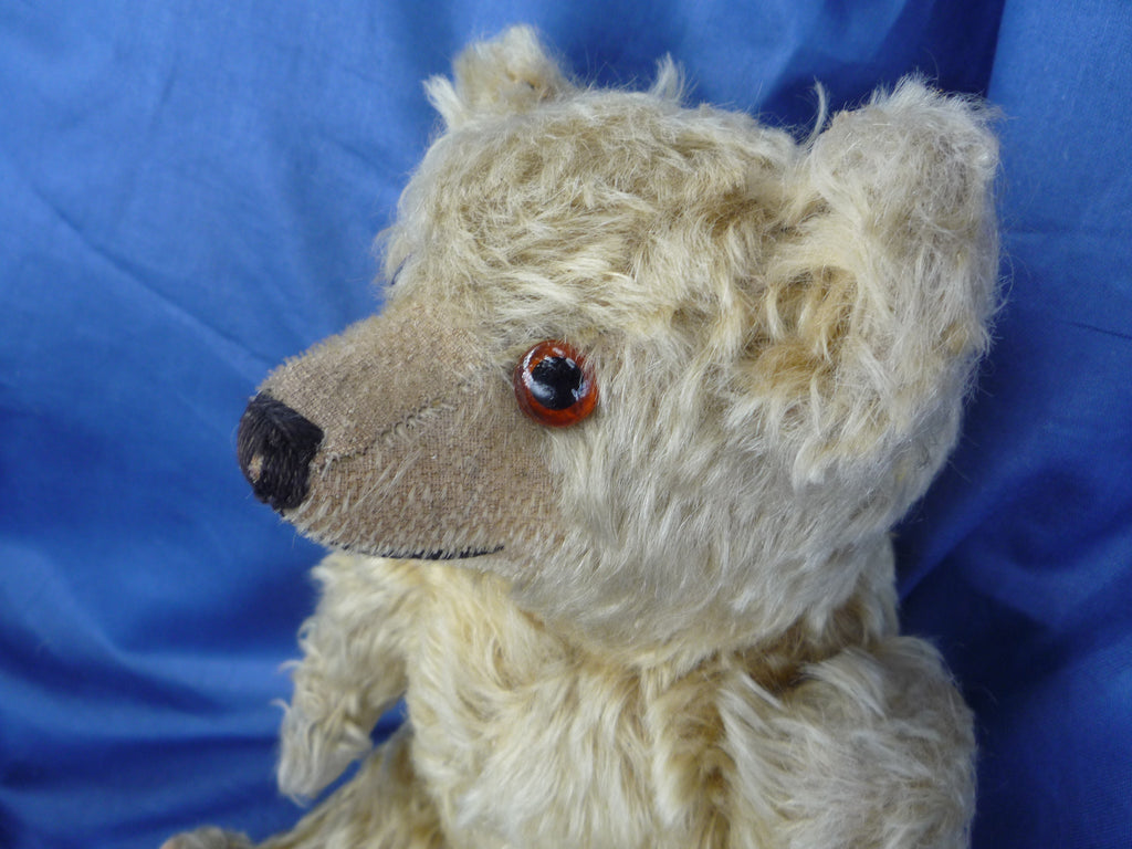 Fabian is a 1920s British teddy bear with blonde mohair, orange and black glass eyes, pronounced clipped upturned muzzle, black stitched nose, mouth and claws, swivel head, jointed limbs with felt pads and card lined feet, rounded hump and inoperative growler —15in. (38cm.) high (slight general wear)