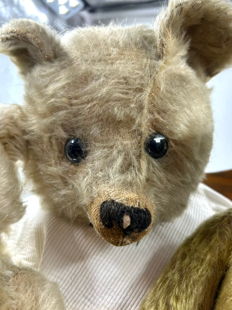 Edward, a rare 1920 Harwin Teddy Bear with golden mohair, oily clear and black glass eyes with remains of dark brown painted backs, black stitched nose with nostrils, remains of W shaped mouth and long claws, ears set on the sides, swivel head, jointed elongated limbs with felt pads, hump and growler. 21' tall.