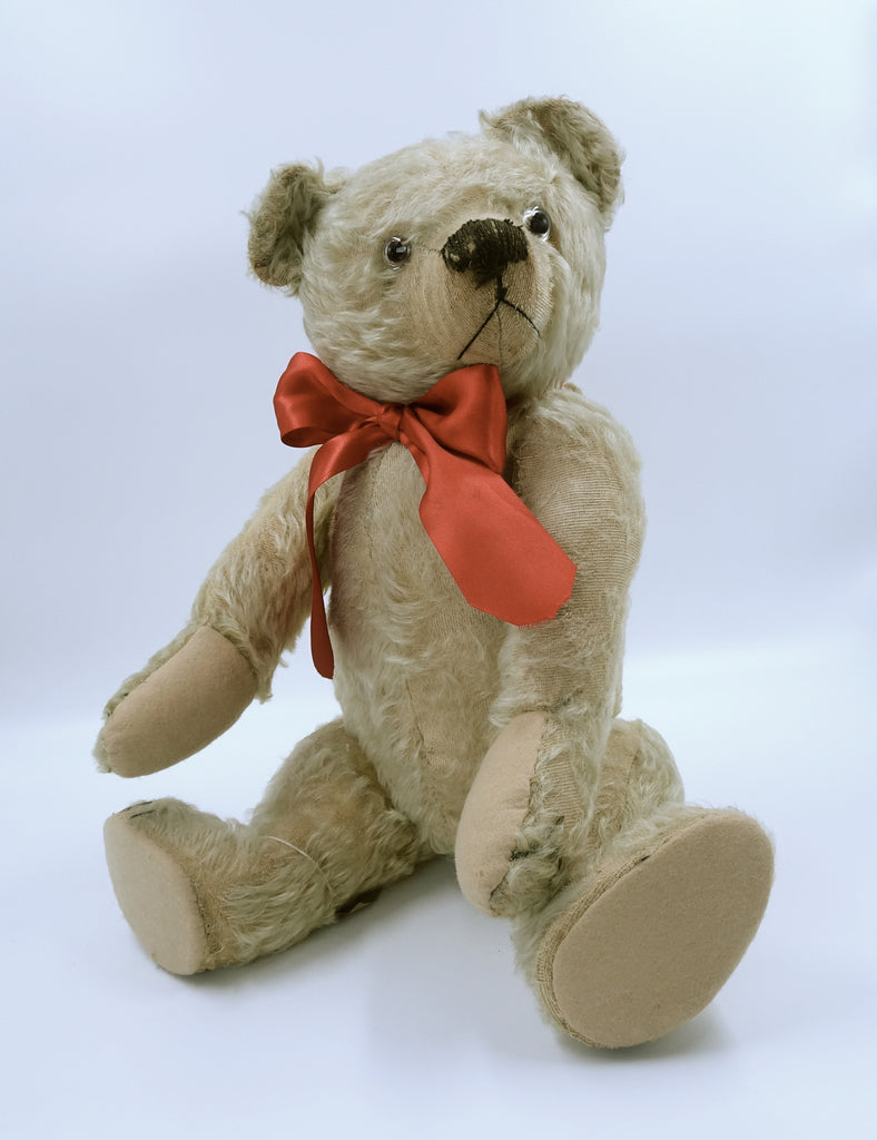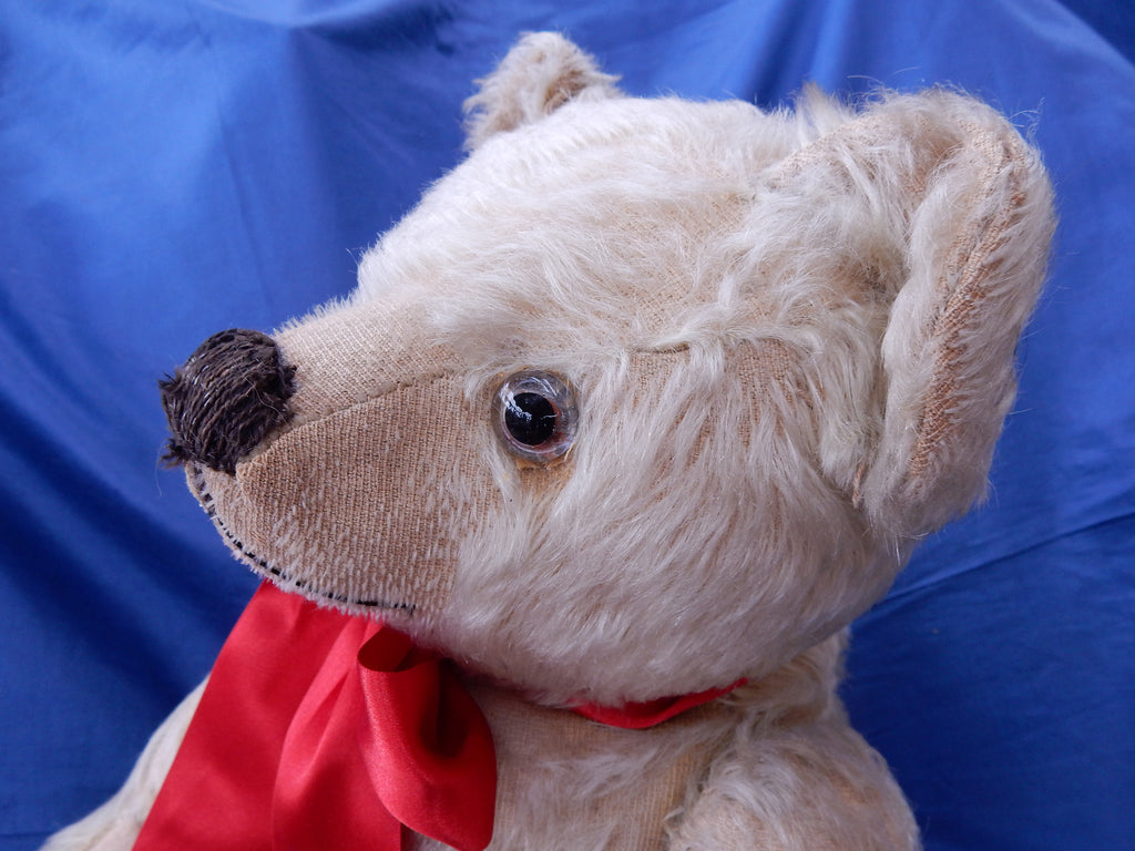Alexander is a 1930s Farnell teddy bear with light golden mohair, clear and black glass eyes with remains of brown painted backs, pronounced clipped muzzle, large black stitched nose, mouth and remains of claws, swivel head, jointed limbs with replaced felt pads and card lined feet, rounded hump and inoperative growler —21in. (53.5cm.) high (bald areas, general wear and thinning,
