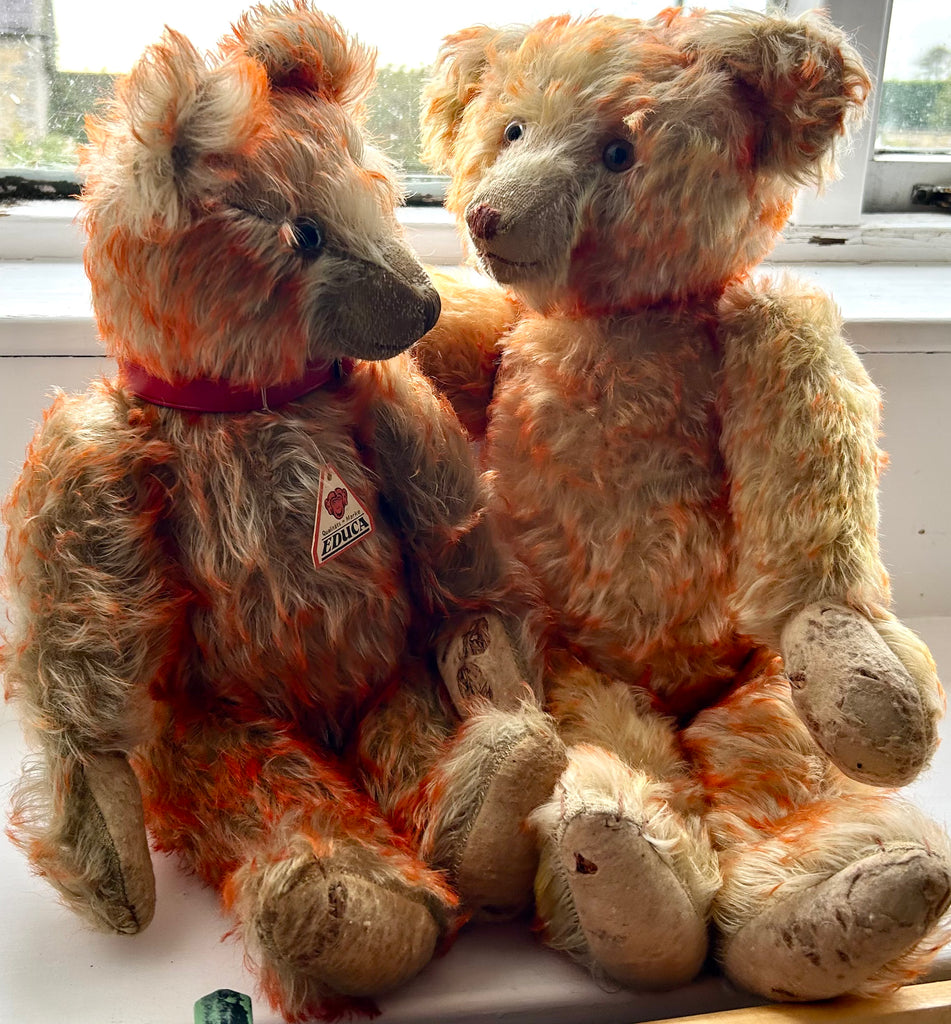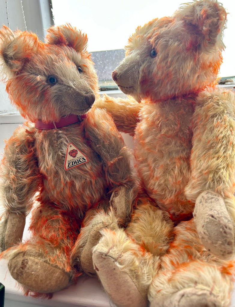 "Herr Orange" is what I call this rare orange tipped Eduard Crämer (EDUCA) teddy bear from the early 1920's. He is a huge with excellent mohair coverage.. Woodwool stuffing. All 5 joints work well. Everything is original All in all a lovely, long-armed, hunchbacked old Classic bear with lots of charm.