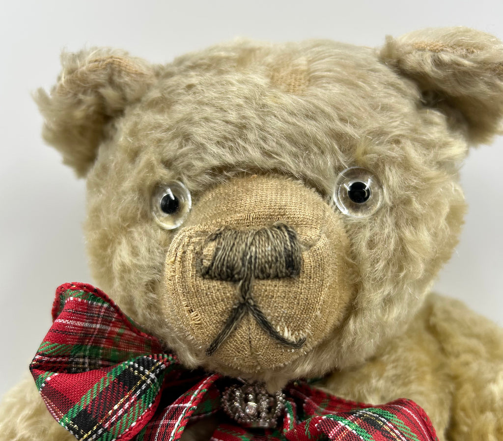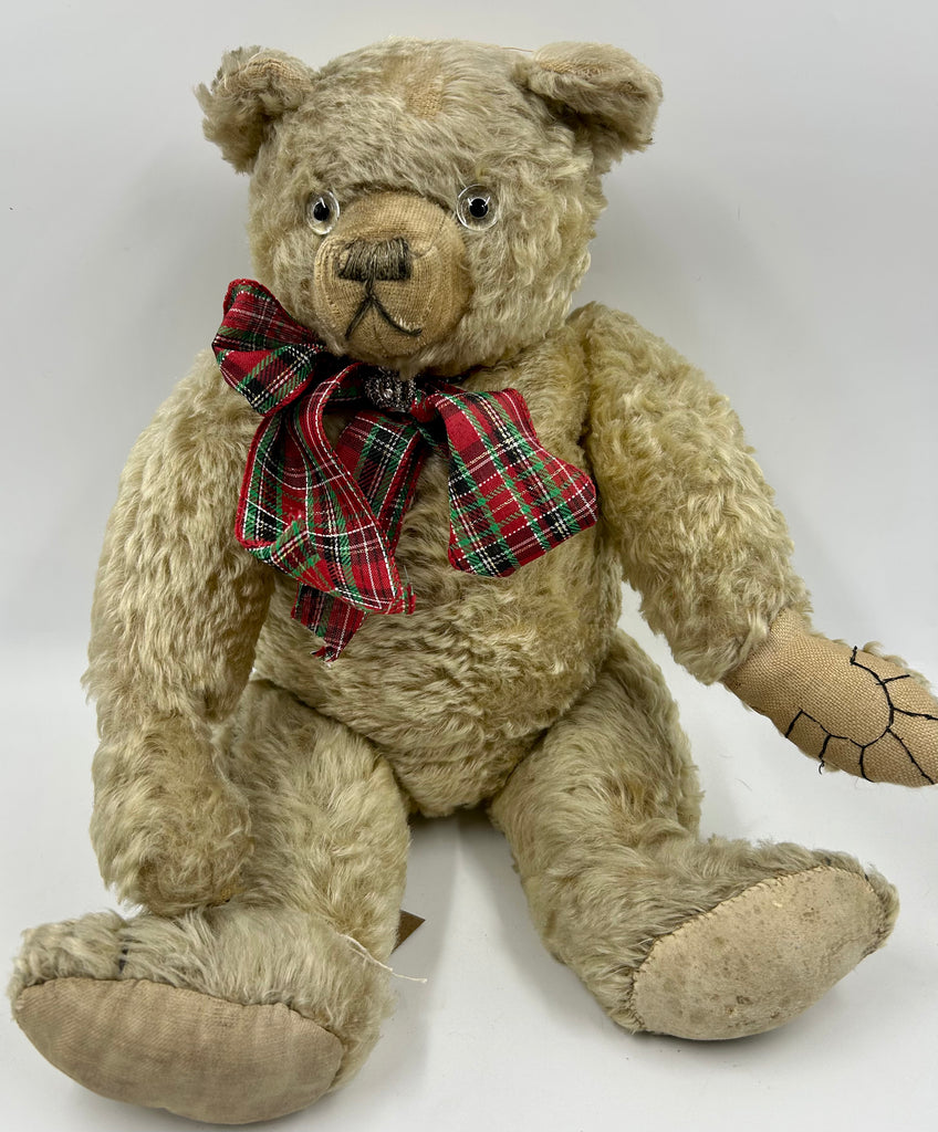 Winnie a wonderful WW1 Farnell bear measuring around 21" with no less than 90% of his white Yorkshire mohair remaining and a now non working growler that clunks when he's tilted. All of the pads look to have been replaced long ago one hand pad is sloth the other linen with signature webbed paws. Winnie has original nose and mouth stitching. A fabulous early Farnell bear with a somewhat grumpy expression perhaps he needs some honey