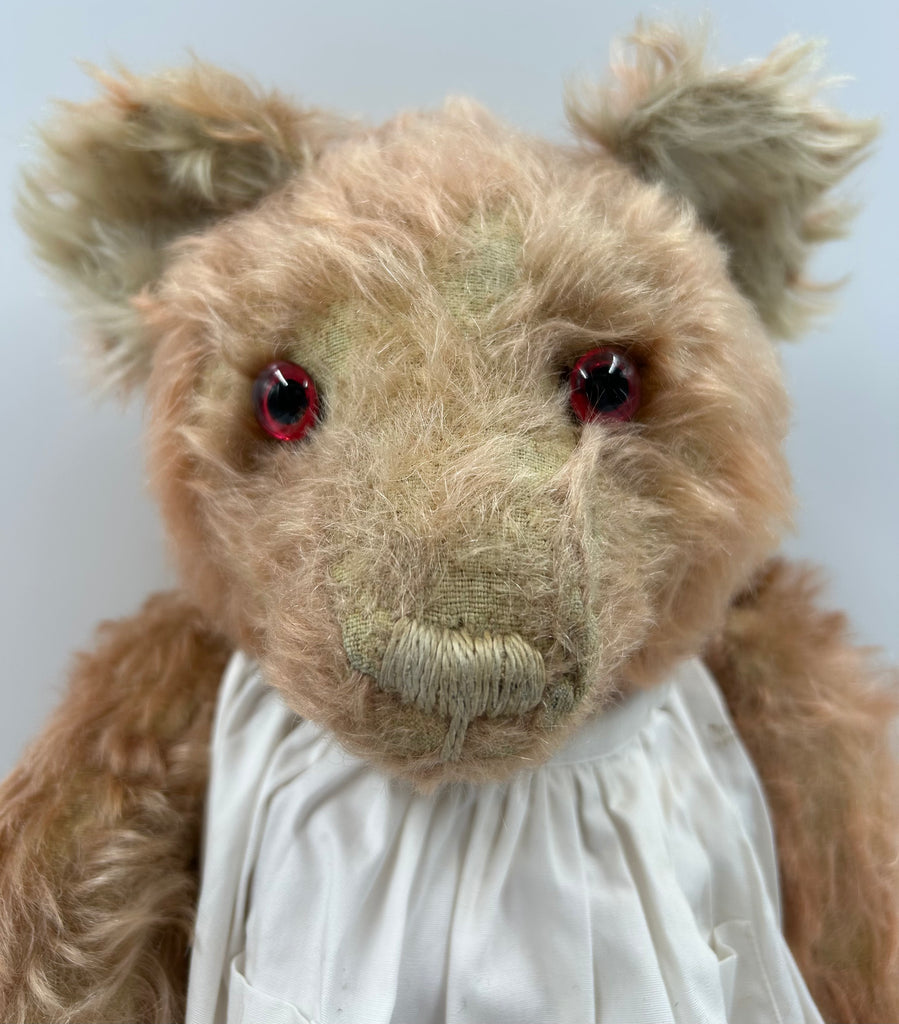 This is Pink Ears a super 1920s mohair 20" Farnell. He is a very rare 20” golden brown Farnell with pink ear fronts, pink nose and claws and red eyes...all original. Faded to dusky pink now and ear fronts faded to white, bar a tiny bit at the bottom where you can see the pink.