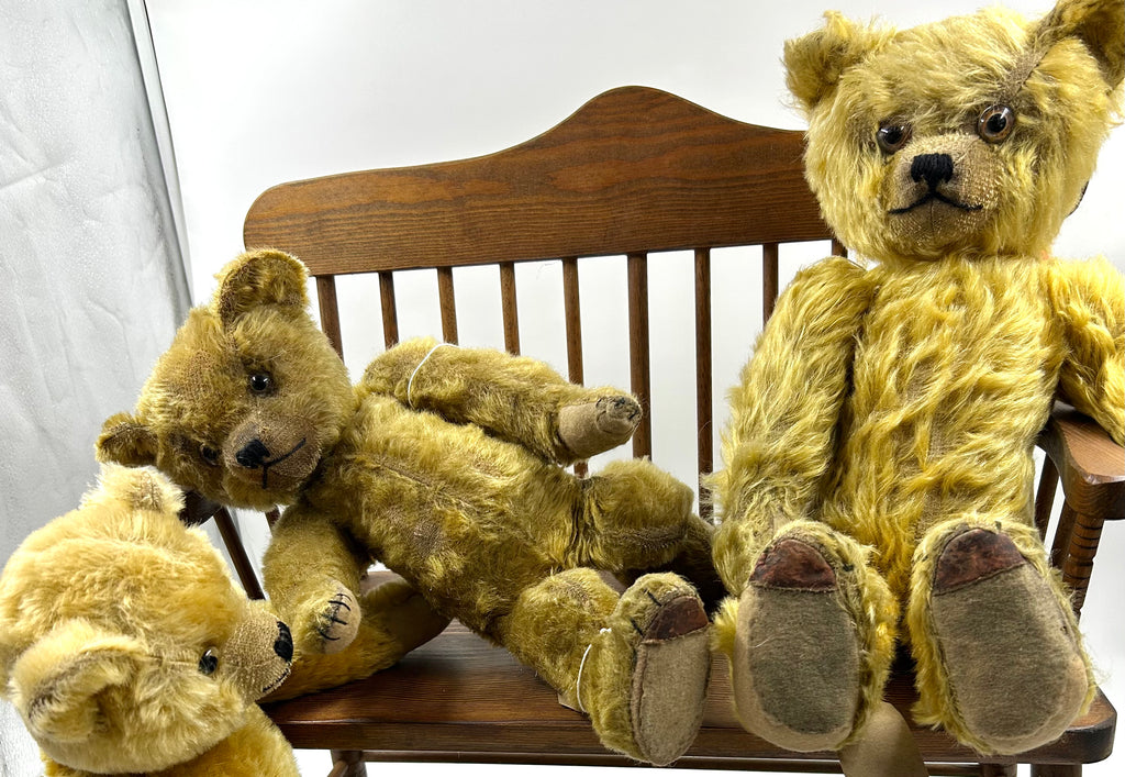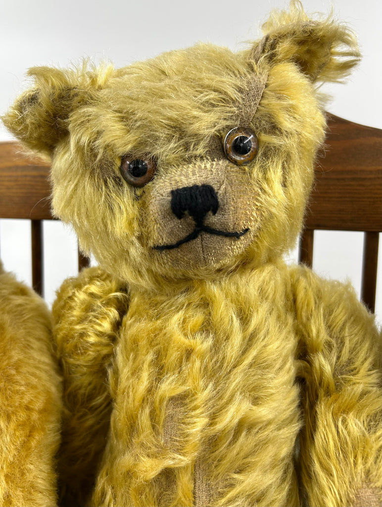 A rare and fine Omega walking teddy bear 1920s, With golden mohair, clear and black glass eyes with brown painted backs, black stitched nose, mouth with a stitched down below mouth and claws coming slightly onto hand pads, swivel head, jointed arms with felt pads and hinged and weighted legs with knees and felt pads with a leather toe and growler